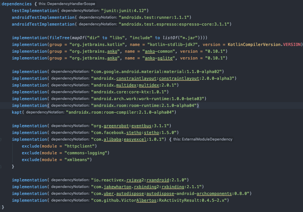 BF7ACB4B-27C1-42EF-87B0-6E8FA4A0E6F6.png - 接下来,就是重点各个文件的改写了,主要是涉及到原来 gradle 中的函数,成员设置,变为 kotlin 的标准语法(groovy 实在是太自由了,自由的有点混淆概念),由于分开讲的话,篇幅长且不一定有图直观,所以就直接上图了(其实也没必要从这里拷贝,因为自己改写的时候基本上都是报错的地方改一下就行了)