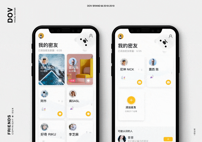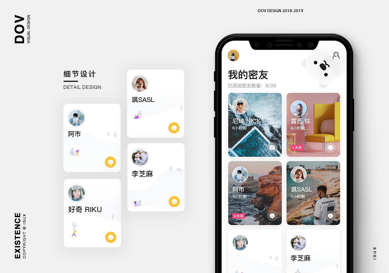 尽管人们可以借助社交网络实现“好友”遍天下,但真正的密友屈指可数,而且数量基本保持不变,结交一个新朋友往往会冷落一个老友。在DOV的密友生态环境中,我们希望杜绝泛泛之交,去限制每个用户的密友的数量,从而让用户去珍惜每一个名额。视觉样式上采用卡片的形式,强化视觉上的个人意识。通过大投影的卡片来与背景的白色拉开层次距离,让整体卡片更加立体。同样,排版上采用左齐的排版设计样式,采用大字体的标题设计,偏向于海报的排版 。