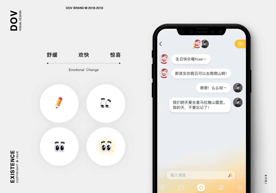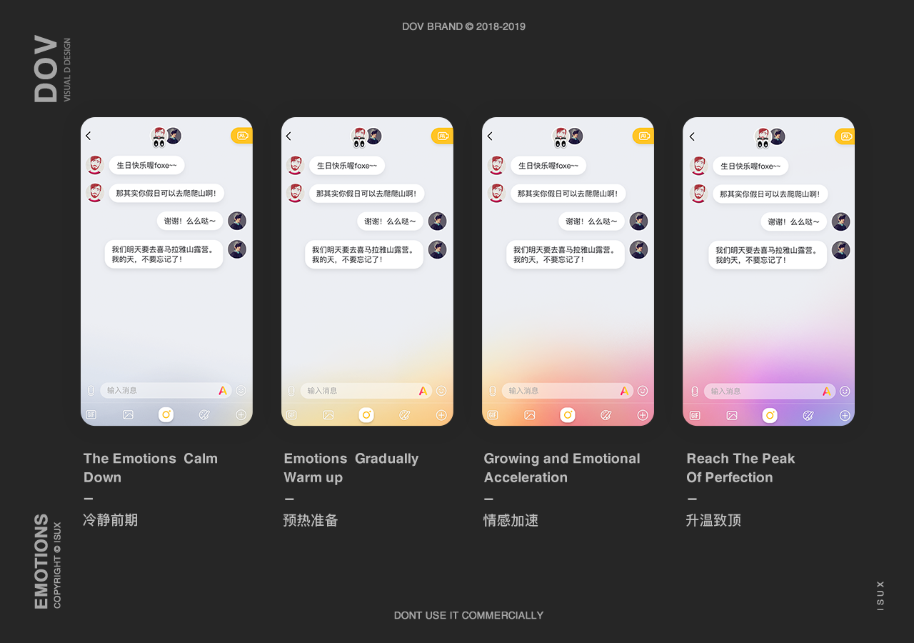 DOV的AIO背景,从视觉层面体现实时的社交情感温度。背景颜色会随着聊天热度变化从淡漠的浅灰色逐渐升温到柔情的橙黄色,最终到达至炙热的红紫色。通过视觉的表达上的色温感受来透传好友之间的亲密热度。