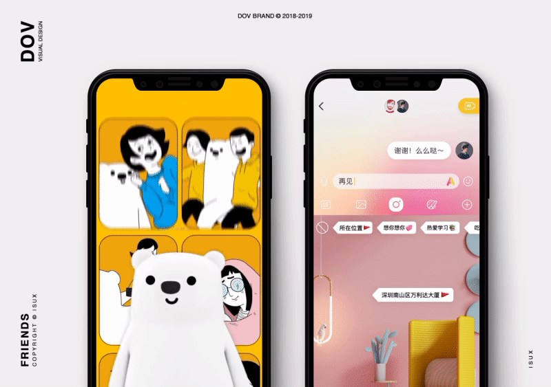 首先,在各个推荐渠道中强调“密友”概念。用户需要通过一份”真假朋友大考验“,才能获得友谊的通行券。在诸多运营活动页面的设计中,DOV使用了同一套字体系统和类似的四方连续底纹,保证设计风格和氛围的统一化。整体设计风格偏娱乐化,同时兼顾DOV的品牌风格,深化产品在用户心中的形象定位,帮助用户首次接触DOV这个产品时,留下完整性的品牌印象。