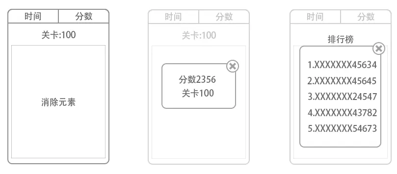 回想儿时我们玩的传统消除游戏,点开游戏图标直接就进入游戏界面开始玩,然后就是结算界面,复杂点的会有个排行榜的界面下图示意: