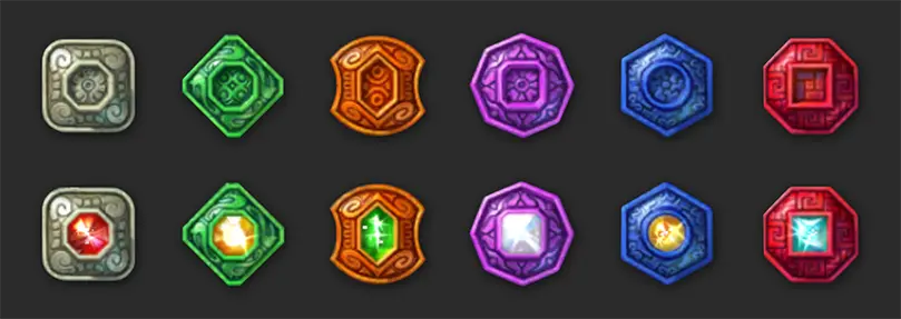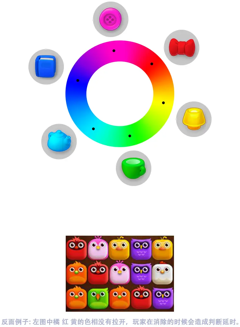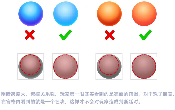 对于单个珠子上的颜色:色相明暗跨度不要太大,因为玩家第一眼看到珠子其实是看到珠子的亮面处,如果跨度太大会影响玩家的第一时间判断珠子,请不要以画普通icon的思维方式画珠子。