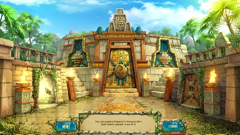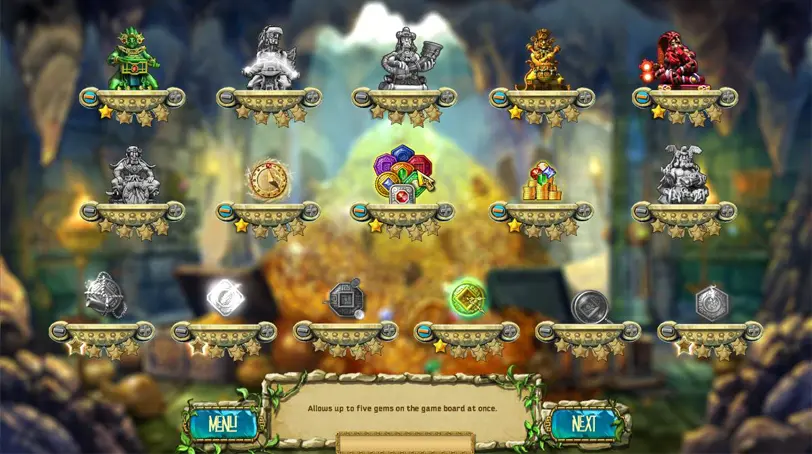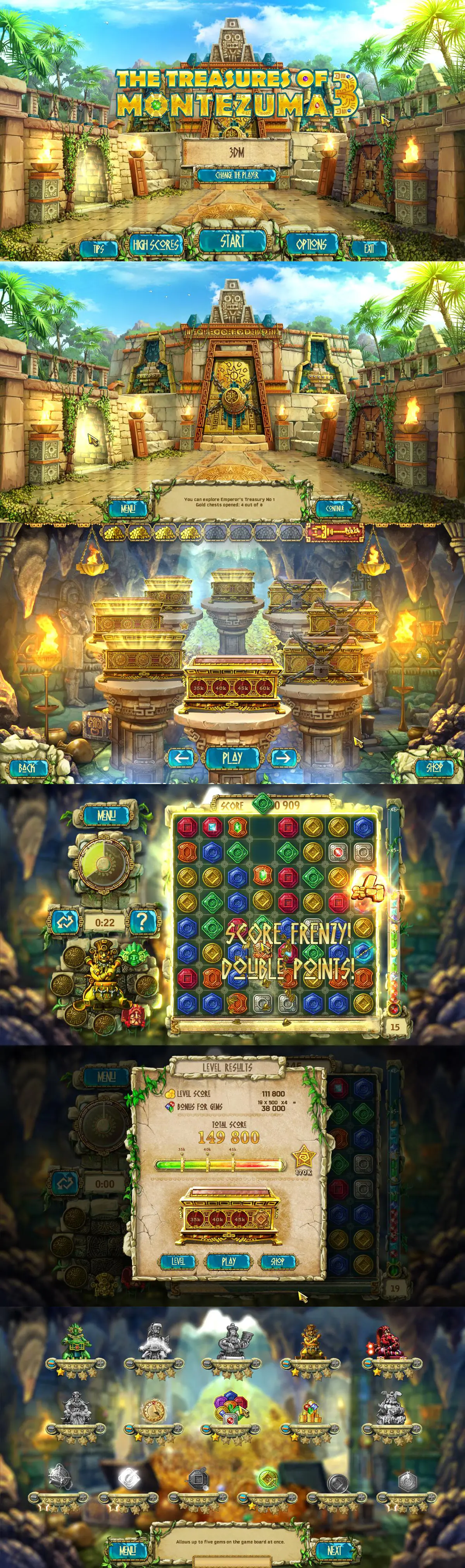 《蒙特3》系列和同年及以前的消除游戏不同,他有完整的故事主题性——秘境寻宝。为了迎合主题,美术风格的统一就起到至关重要的作用,为了让整个游戏的探秘感更加贴合鲜明,它的UI面板是砖土质感+植物藤蔓的基调,内部的珠子是符文+镶嵌宝石,背景是金币和宝藏的堆砌 ,既保持了消除游戏的基本玩法,又加入了通过消除获得道具并激活图腾神像帮助你推进关卡的idea,并且神像的动特展现让人视觉上也很有爽感。