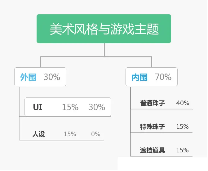 欧美与国内制作游戏的最大区别,我想就是前者更注重感觉,后者更更注重品质。国内专注做欧美市场的公司并不多,某P公司的做法就是前期拼图然后拿到市面上AB测试,哪怕前期美术进度为0,但等测试结果出来之后,才开始具体美术方面的制作,并没有让美术做先驱执行,当然欧美注重感觉并不是说不在乎美术品质,其实是好劲使在刀刃上,在阐述问题前,结合实际参与项目我做了一个树状图,让我们了解一下对于消除游戏来说,它的“刀刃”在哪里: