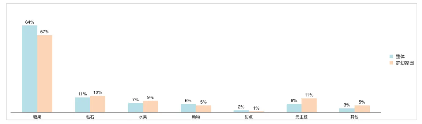 上图是消除游戏中喜欢珠子风格的占比,在消除游戏群体中,糖果的接受度最高,然而喜欢家园题材的玩家,对糖果类珠子接受度也很高。