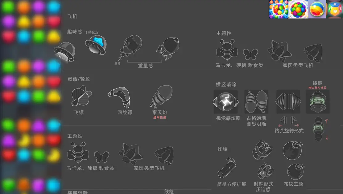 趣味感 - 设计的本质灵魂就是将本体变得更有趣味感,基本珠子如此,特殊珠子也如此。好的珠子要配好的动特,才能让整个画面变得高级,然而欧美的交互手感整体比国内的高级很多。《梦幻家园》的动特目前是我见过所有消除游戏里消除手感最好的,没有之一。其实也有不少消除游戏公司把家园的动效单帧拆分出来,学习运用到自己的游戏里。有兴趣的伙伴可以自己录视频感受下。