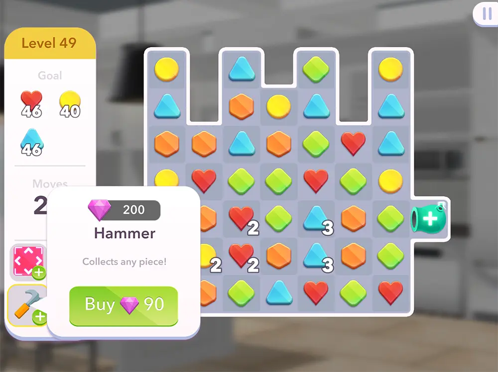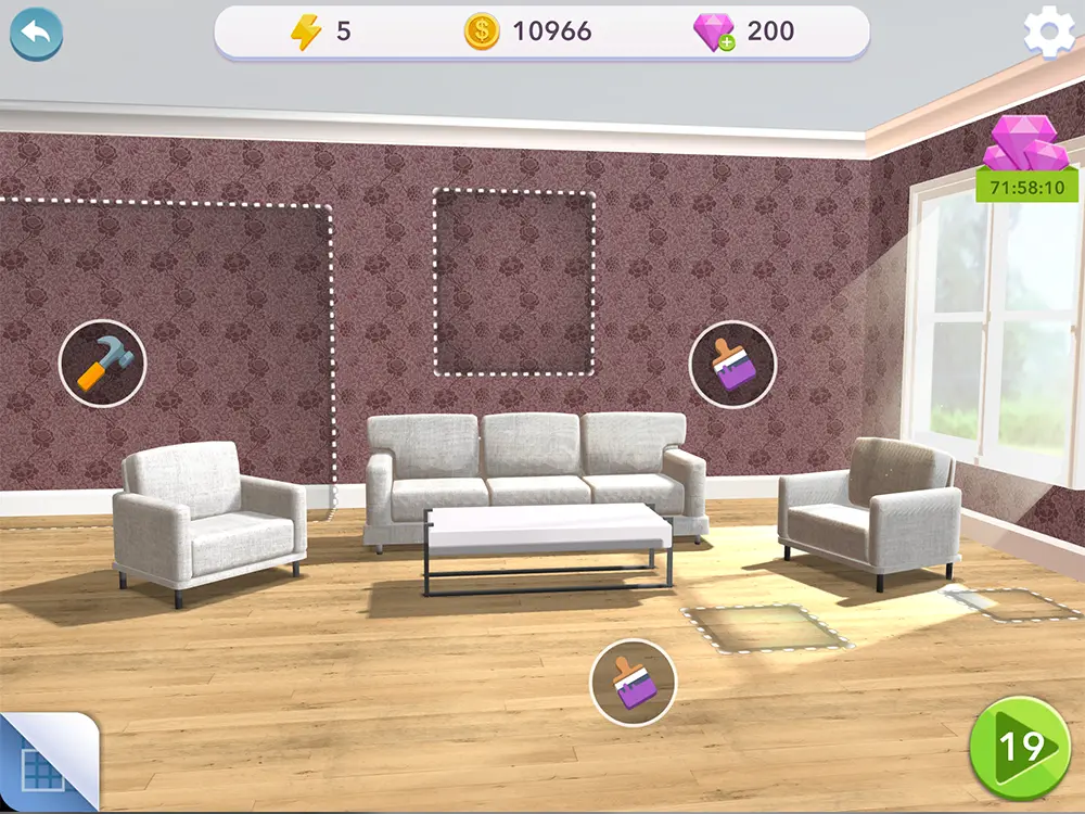 欧美对消除游戏的G点还是很敏感的,他们在不断进化、革新,《梦幻家园》就是很好的例子,如果说之前品类的消除游戏是倾向女性玩家为主群体的一款游戏,那么家园就是跳脱出这个思维范围,男女同吃的一款新型消除游戏。女性玩家的游戏倾向无非这几关键词:家庭类、模拟经营、探索类、养成、换装、互动剧情 。其实只要把任意一个关键词和消除游戏做结合,都能成为一个受众广的游戏。如果说《梦幻家园》并不能代表消除游戏的流行趋势,那么这款消除游戏肯定会打破你的认知《 Home Design Makeover》这是一款下载量并不高,但是付费率很高的3D家装题材的消除游戏。如果你玩两盘就会发现,它里面的内容其实很简单,可以说是很朴素的吃藕,但它的确是受众欧美人群。