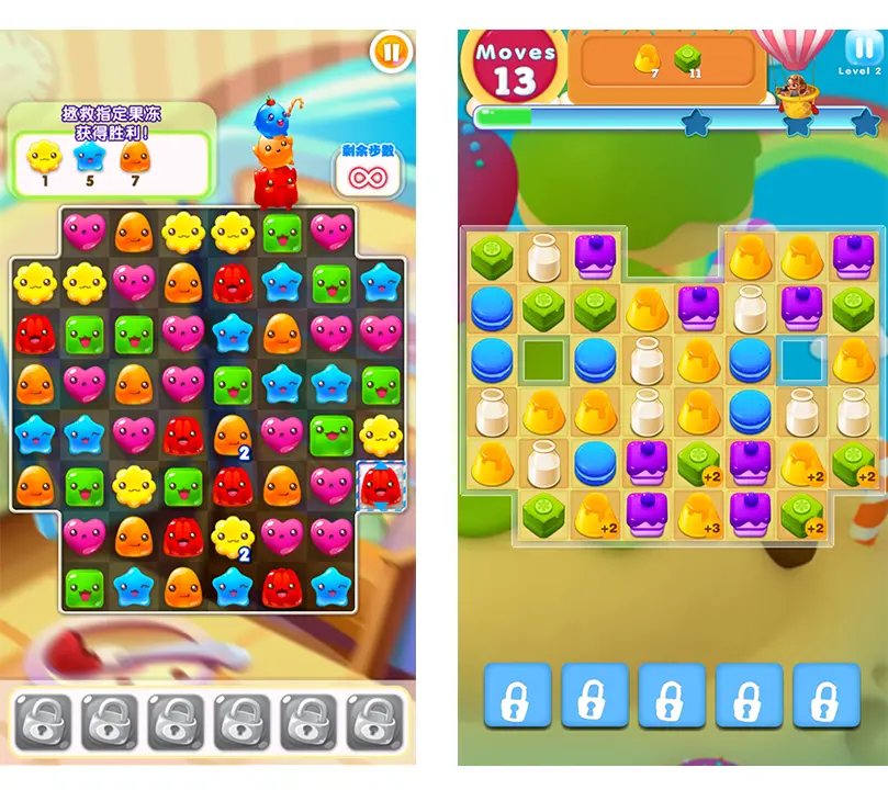 而国内的消除游戏, 在美术风格的视觉感官上更为清晰定位为女性群体为主导的表达方式,加上日韩在国内的欢迎程度,美术基调大致分为两种: