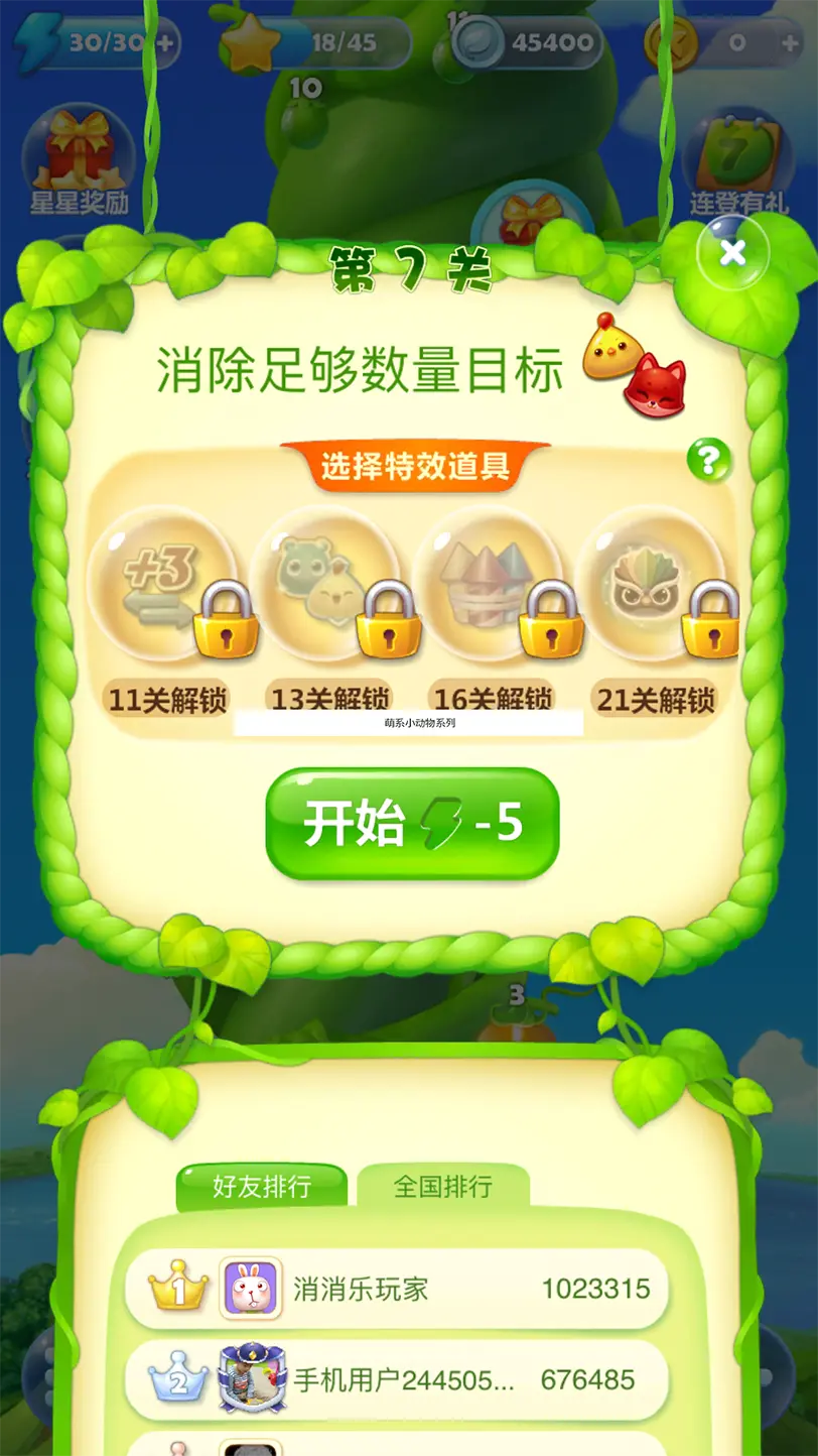视觉层次的循序展现:装饰性叶子的视觉感与关卡标题平级。