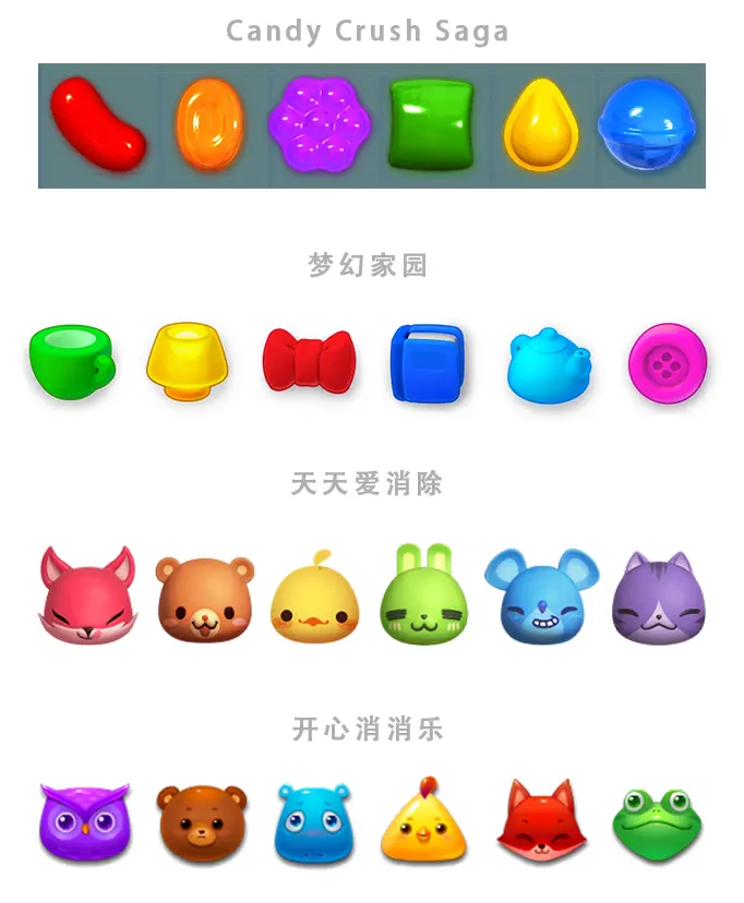 造型 - 他们的基础珠子造型都是基于简单的几何形体去变化的。换句话说,尽量按着几何形体的雏形去设计珠子造型。每个造型在宫格中都是饱满的同时又非常有辨识度的。举个例子:《开心消消乐》和《天天爱消除》对比,你就会发现《天天》的珠子细节相对较多,造型认知心理学上来说,我第一感官是认知动物,而不是图形化认知同类消除的珠子。开心消消乐讨巧的是他在选择动物种类上弱化了比较写实的耳朵,在动物的选择上尽量靠近几何形体,所以视觉上第一眼看到的就很整体的高辨识度珠子。在《家园》中,他每个珠子重叠起来都趋近一个圆的造型,这也是一种整体且构图饱满的设计思路。