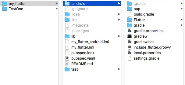 上面的命令会创建一个flutter的项目模块,在flutter文件夹中有一个.Android的隐藏文件夹,里面包裹了一个安卓库的工程模块。