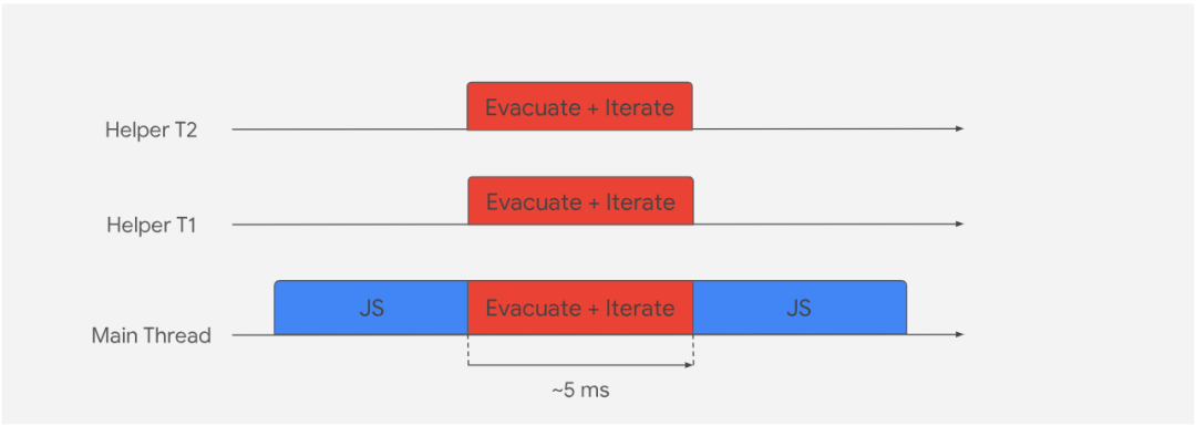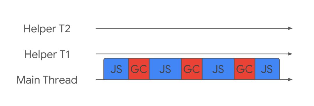 这些任务可以按照顺序或者交叉地执行。一种方式是暂停 JavaScript 的执行,在主线程上按照顺序去执行这些任务。这样做导致的结果就是 JavaScript 延迟执行,以及页面渲染时 JavaScript 来不及执行导致的页面空白或者卡顿问题(jank)。这个问题在之前的两篇文章( https://v8.dev/blog/jank-busters, https://v8.dev/blog/orinoco) 已经探讨过, 这样做同时也会降低JavaScript执行的吞吐量(throughput)。