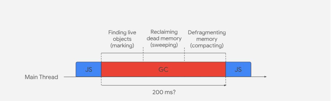 这些算法和优化在很多垃圾回收相关的文献或着具有垃圾回收机制的编程语言中都是非常常见的,但是这些先进的垃圾回收机制已经经过了漫长发展。测量垃圾回收所花费时间的一个重要指标就是执行垃圾回收时主线程挂起的时间。对于传统的 ‘stop-the-world’ 垃圾回收器来说,垃圾回收所花费的时间可以直接简单相加。而这种垃圾回收的方式直接影响了用户体验,会直接导致页面卡顿,渲染延迟等一系列问题。