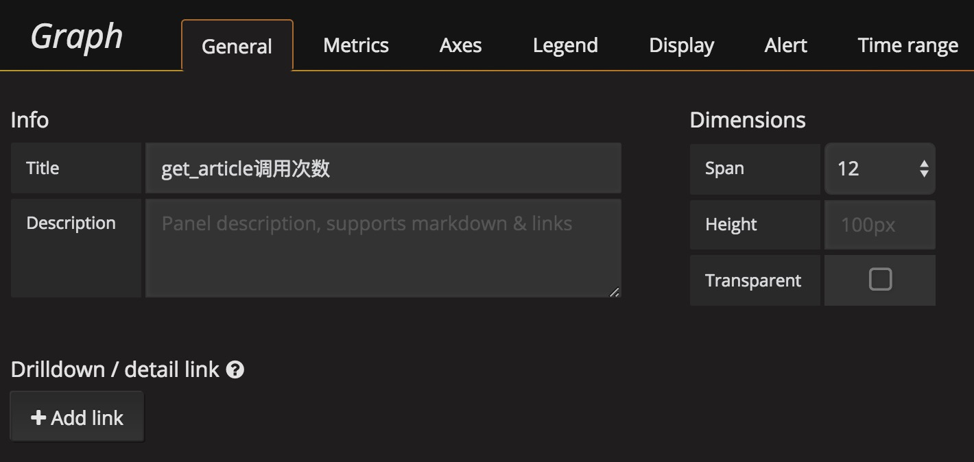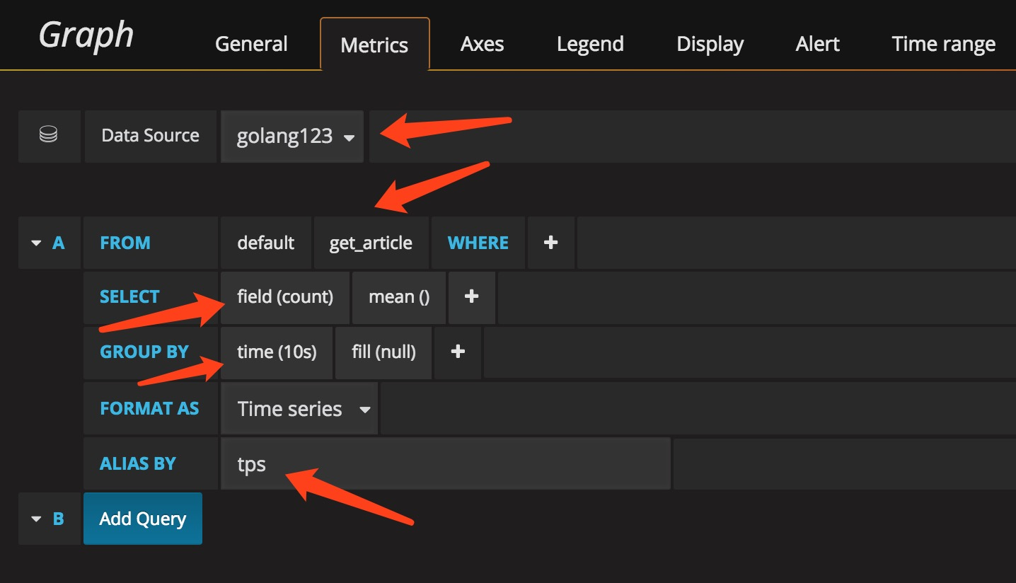 在Metrics中选择数据源为golang123,然后依下图箭头处填写