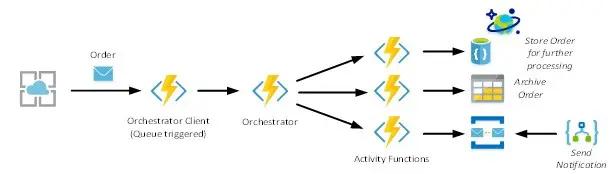 public static async Task Run(DurableOrchestrationContext context, object order, ILogger log){log.LogInformation($”Data = ‘{order}’.”);var orderDetail = (OrderDetail) order;try{bool x = await context.CallActivityAsync<bool>(“WriteToDatabase”, orderDetail);log.LogInformation($”Data storage = ‘{x}’.”);if (x == true){await context.CallActivityAsync<OrderDetail>(“WriteToArchive”, orderDetail);await context.CallActivityAsync<OrderDetail>(“SendNotification”, orderDetail);}}catch (Exception){//ErrorHandling}}Each of the activity functions will perform a task — in this case, store the order in a document collection in a CosmosDB instance, archive the stored message, and send a message to the queue to send out a notification via a logic app.