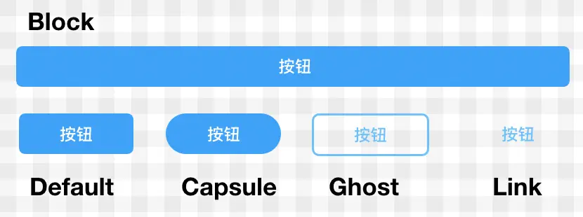 | 按钮形状 | 链接按钮 link, 幽灵按钮 ghost, 胶囊按钮 capsule, 块状按钮 block |