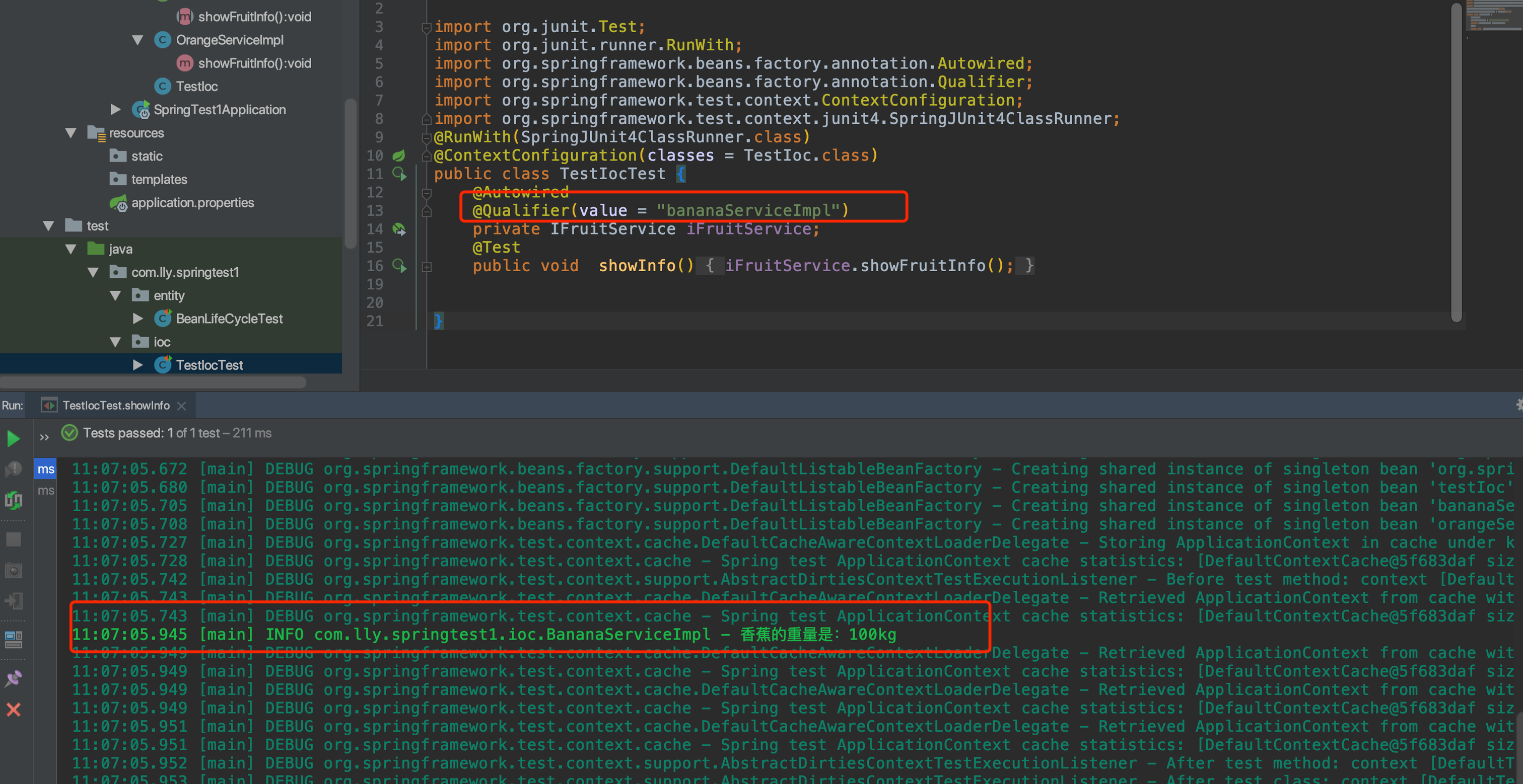 Caused by: org.springframework.beans.factory.NoUniqueBeanDefinitionException: No qualifying bean of type 'com.lly.springtest1.ioc.IFruitService' available: expected single matching bean but found 2: bananaServiceImpl,orangeServiceImpl