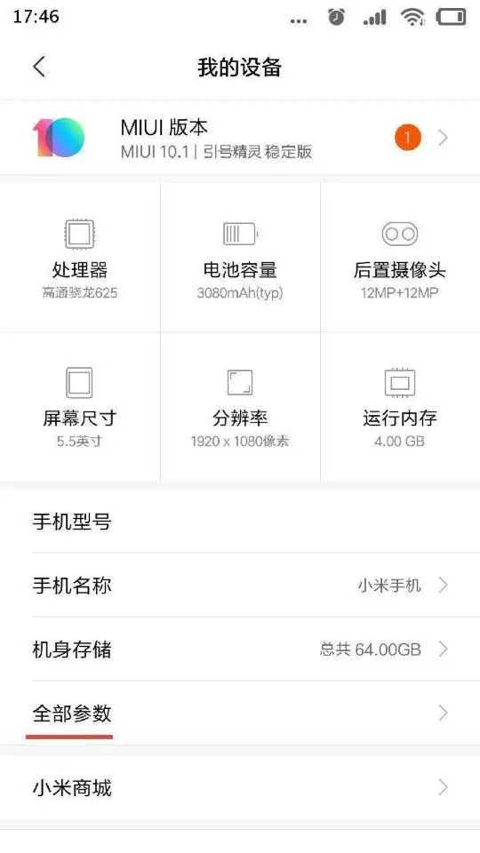 接着找到“全部参数”这一行,点击进入“全部参数”界面。