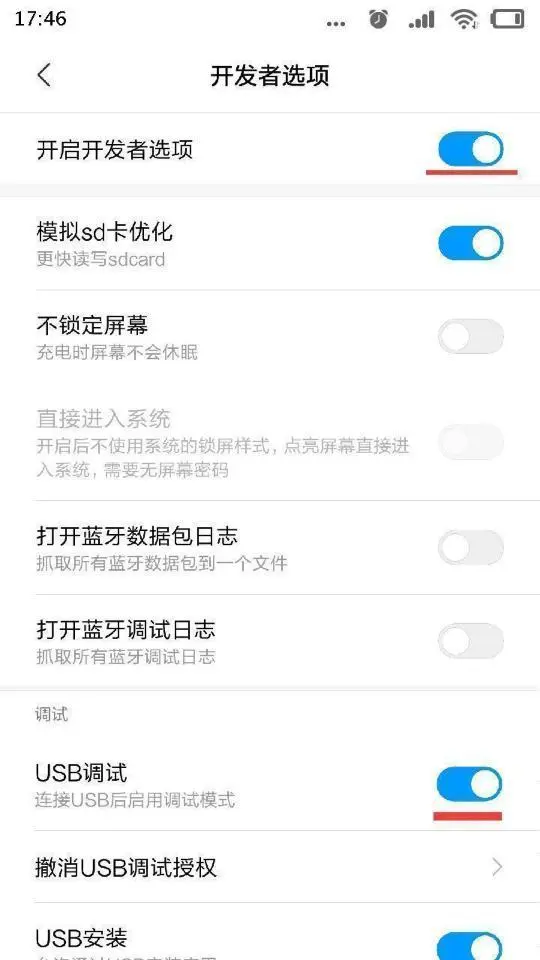 然后打开“开启开发者选项”选项,并打开界面下面的“USB调试”选项。