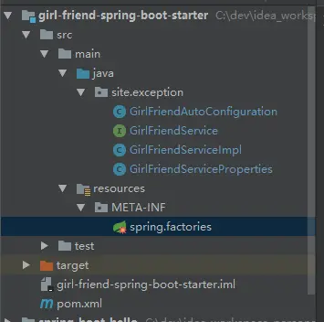 完成这一步后,一个入门级的 spring-boot-starter 已经开发完成了,看下整体的目录结构: