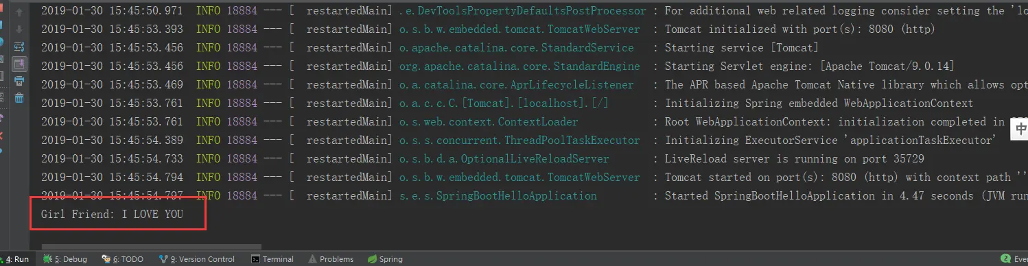 在 Applicaiton 启动类中,自动注入 GirlFriendService 实例,并调用 say() 方法: