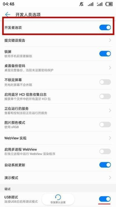 然后,打开“开启开发者选项”选项,并打开界面下面的“Usb调试”选项。