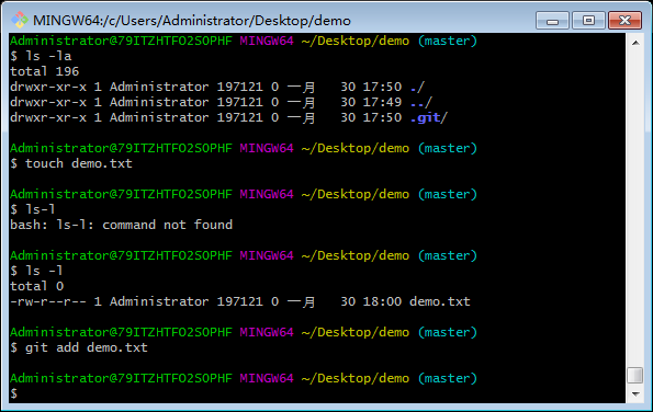 3.输入git add demo.txt添加文件到暂存区