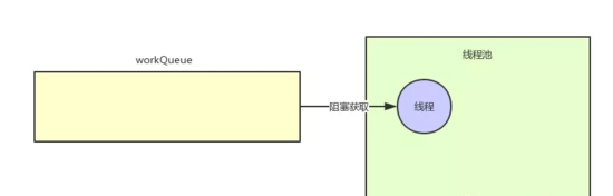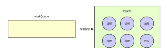 此时线程池里的线程都阻塞式在workQueue上等待获取任务,有一个任务进来就会唤醒一个线程来处理这个任务,处理完了任务再次阻塞在workQueue上尝试获取下一个任务,如下图所示这个意思。