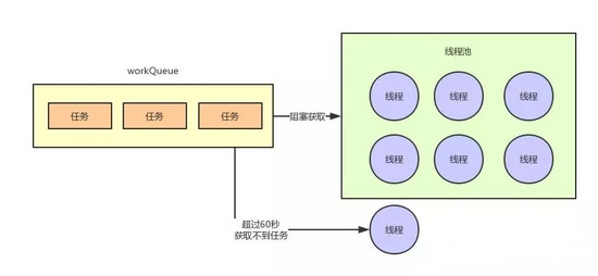一旦超过keepAliveTime指定的时间,还获取不到任务,比如keepAliveTime是60秒,那么假如超过60秒获取不到任务,他就会自动释放掉了,这个线程就销毁了。