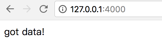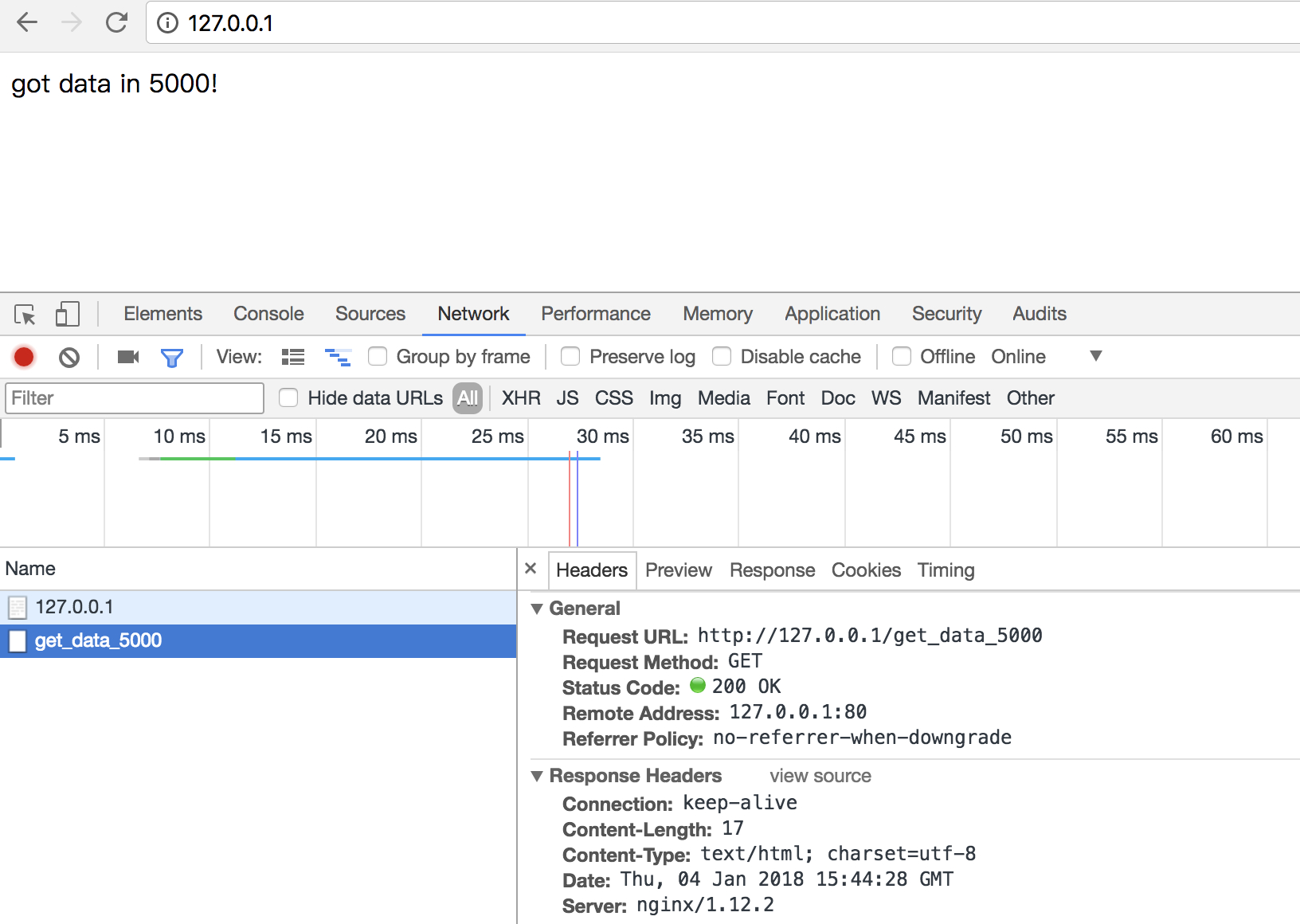 打开浏览器输入:http://127.0.0.1:4000 会返回字符串回去,交给浏览器,其解析运行其中的javascript代码,发出ajax请求,至同服务下的/get_data路由,得到数据后渲染至页面。
