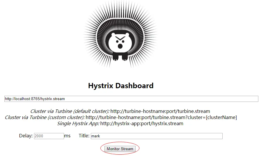 启动应用程序,访问 http://localhost:8765/hystrix.stream,可以查看 熔断器 的 数据指标。访问 http://localhost:8765/hystrix,查看 Hystrix Dashboard 的界面。在界面上填写 数据指标 的 URL 地址,点击 Monitor Stream 进入页面,如图所示: