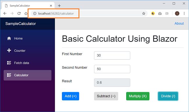 @page "/calculator"<h1>Basic Calculator Using Blazor</h1><hr /><div> <div class="row"> <div class="col-sm-3"> <label class="control-label">First Number</label> </div> <div class="col-sm-4"> <input class="form-control" type="text" placeholder="Enter First Number" bind="@operand1" /> </div> </div> <br /> <div class="row"> <div class="col-sm-3"> <label class="control-label">Second Number</label> </div> <div class="col-sm-4"> <input class="form-control" type="text" placeholder="Enter Second Number" bind="@operand2" /> </div> </div> <br /> <div class="row"> <div class="col-sm-3"> <label class="control-label">Result</label> </div> <div class="col-sm-4"> <input readonly class="form-control" bind="@finalResult" /> </div> </div> <br /> <div class="row"> <div class="col-md-3"> <button onclick="@AddNumbers" class="btn btn-primary"> Add (+) </button> </div> <div class="col-md-3"> <button onclick="@SubtractNumbers" class="btn btnwarning">Subtract (−)</button> </div> <div class="col-md-3"> <button onclick="@MultiplyNumbers" class="btn btn-success">Multiply (X)</button> </div> <div class="col-md-3"> <button onclick="@DivideNumbers" class="btn btn-info">Divide (/)</button> </div> </div></div>@functions {double operand1 { get; set; }double operand2 { get; set; }string finalResult { get; set; }void AddNumbers(){ finalResult = (operand1 + operand2).ToString();}void SubtractNumbers(){ finalResult = (operand1 - operand2).ToString();}void MultiplyNumbers(){ finalResult = (operand1 * operand2).ToString();}void DivideNumbers(){ if (operand2 != 0) { finalResult = (operand1 / operand2).ToString(); } else { finalResult = "Cannot Divide by Zero"; }}}In the HTML part of the code, we have defined two textboxes to read the operand input from the user. We have a textbox to display the result of arithmetic operations. We have also defined four buttons, one for each arithmetic operation. The onclick event of the buttons will invoke the methods that will provide the output. Once it has performed the corresponding operation on both operands.