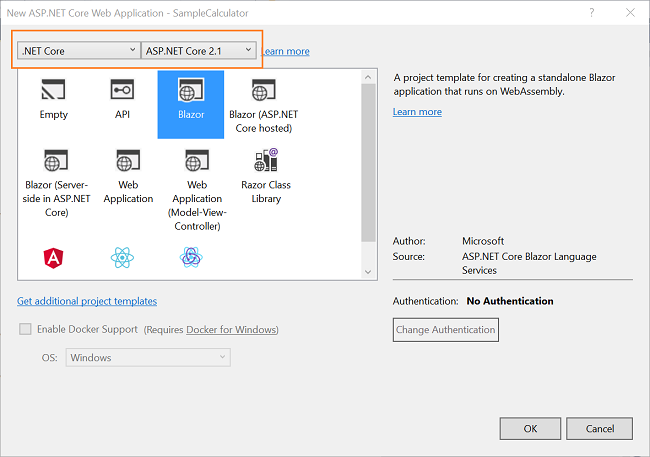 After clicking on OK, a new dialog will open asking you to select the project template. You can observe two drop-down menus at the top left of the template window. Select “.NET Core” and “ASP.NET Core 2.1” from these dropdowns. Then, select “Blazor” template and press OK.