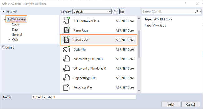 To create our component, right-click on SampleCalculator/Pages folder and then select Add >> New Item. An Add New Item dialog box will open, asking you to select the desired item template from the provided list of items. Select ASP.NET Core from the left panel, and then select Razor View from the templates panel. Put the name of file as Calculator.cshtml and click Add.