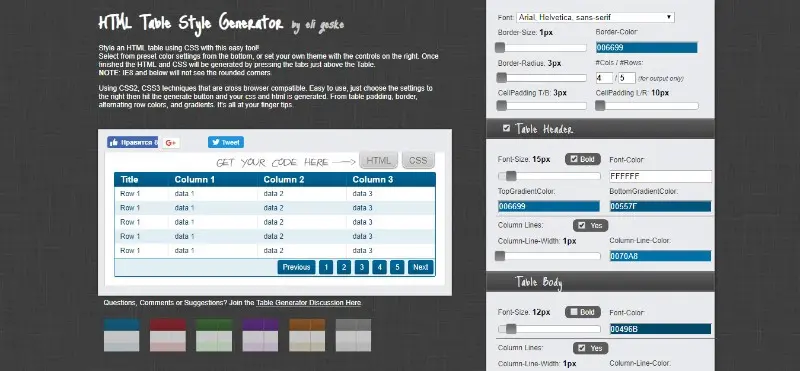 Use table CSS elements and create gorgeous HTML tables with this online tool.