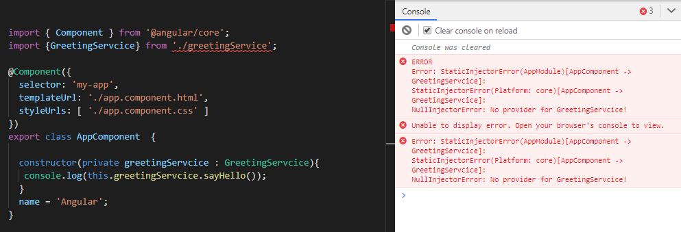 Import {Component} from '@angular/core';Import {GreetingService} from '. /greetingService';@Component({ selector: 'my-app', templateUrl: './app.component.html', styleUrls: [ './app.component.css' ]})export class AppComponent {constructor(private greetingService : GreetingService){ console.log(this.greetingService.sayHello()); }}Now if you run this project, you will get the error “No provider for GreetingService!”