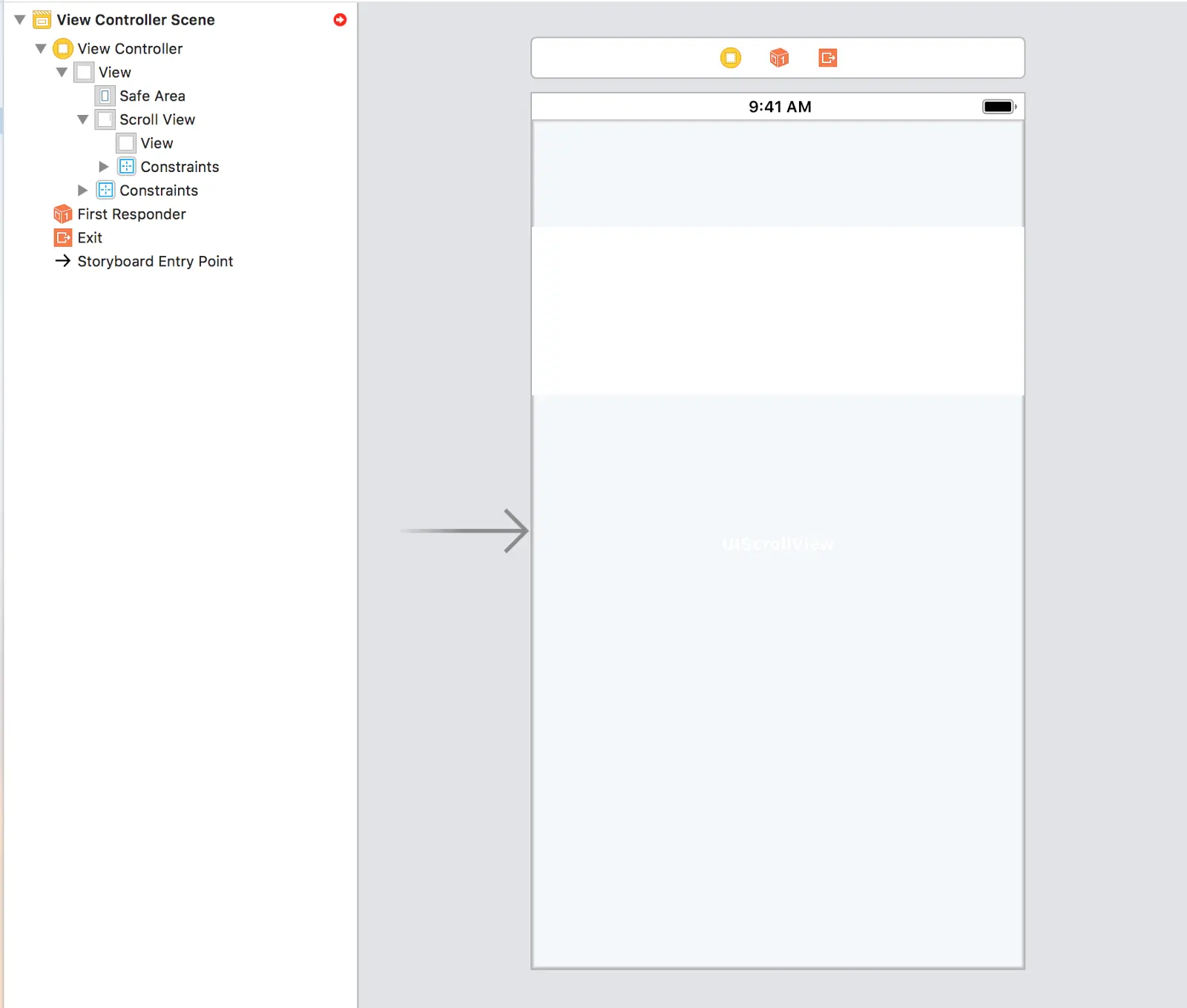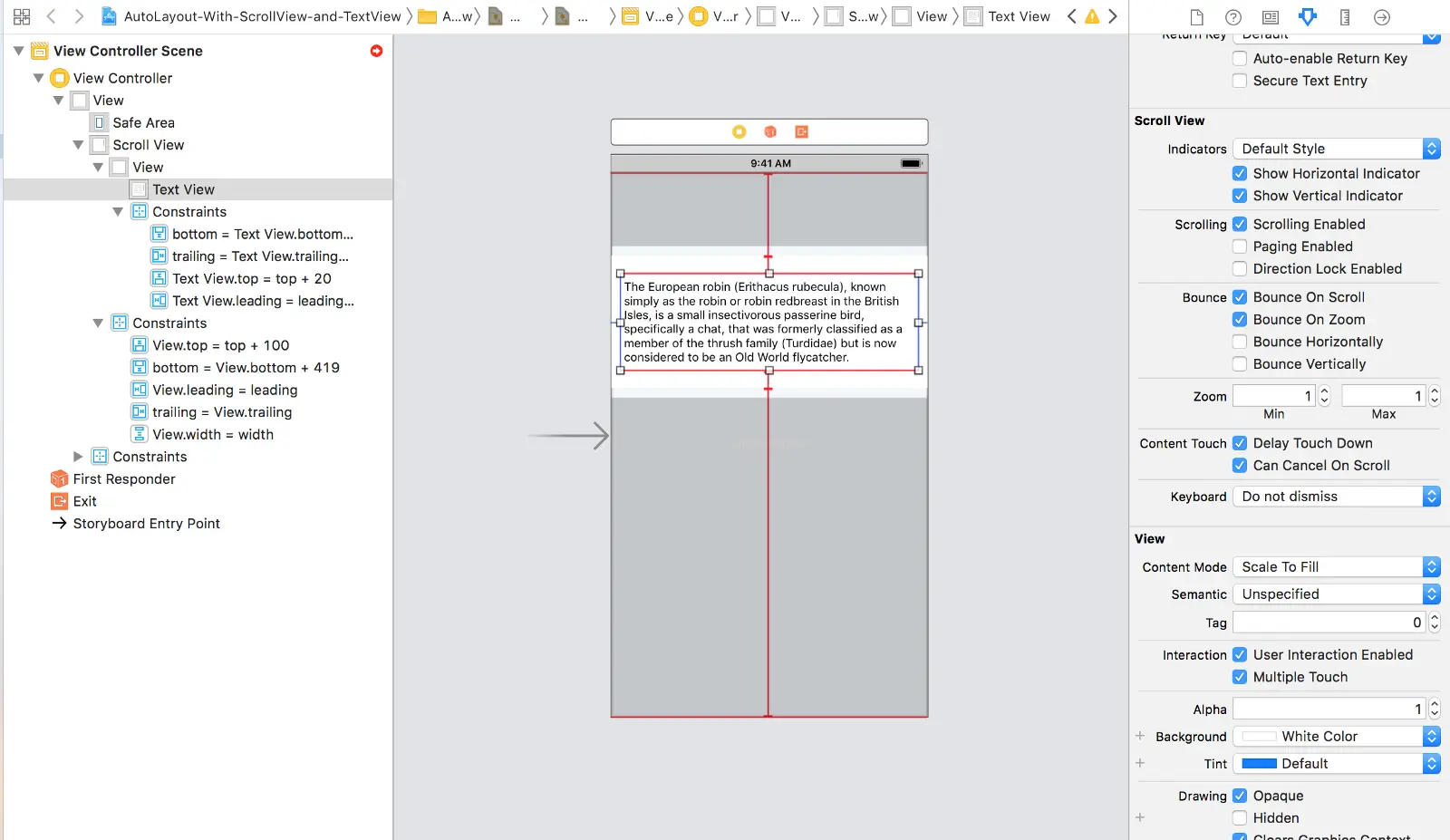Why? Constraining the View this way means that a child Text View element we add works properly with Auto Layout. This happens because we constrain the Text View to the bottom of the View (which we anchored properly to the bottom of the Scroll View!) instead of directly to the bottom of the Scroll View.