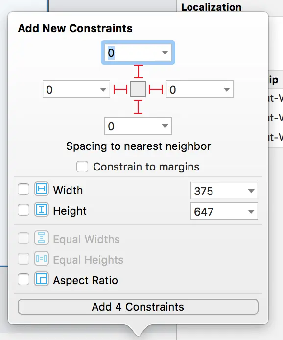 Click on the View element in the object hierarchy and drag+release your cursor onto the Scroll View element above it in the hierarchy. Click on the 4 topmost options to apply these constraints. Click on the ‘Equal Widths’ to apply this constraint also.