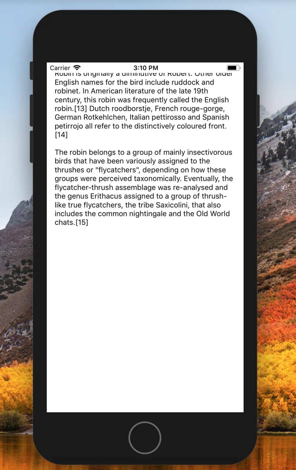 All information about robins for the Text View content is directly from Wikipedia. Thanks to the community for this.