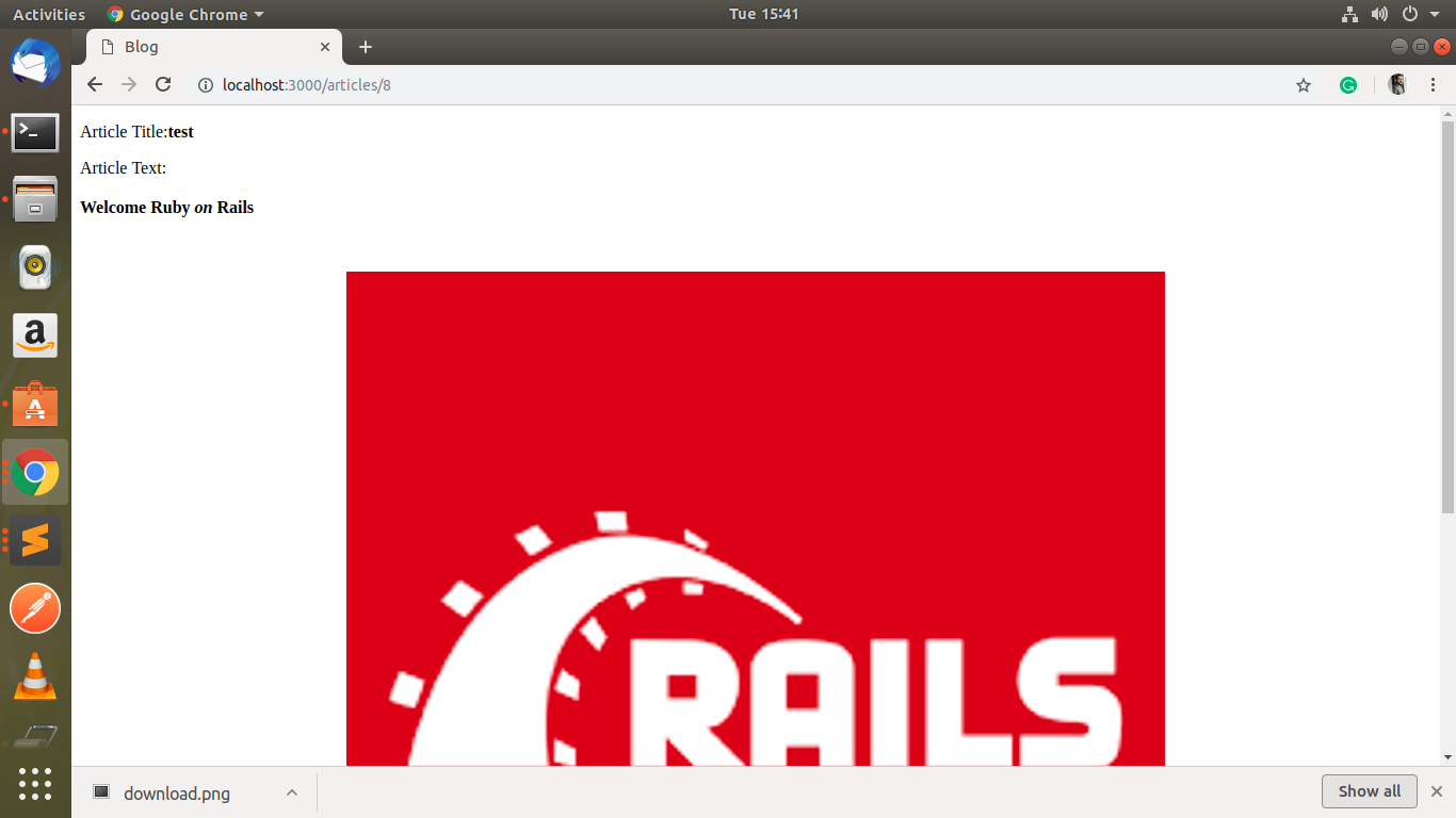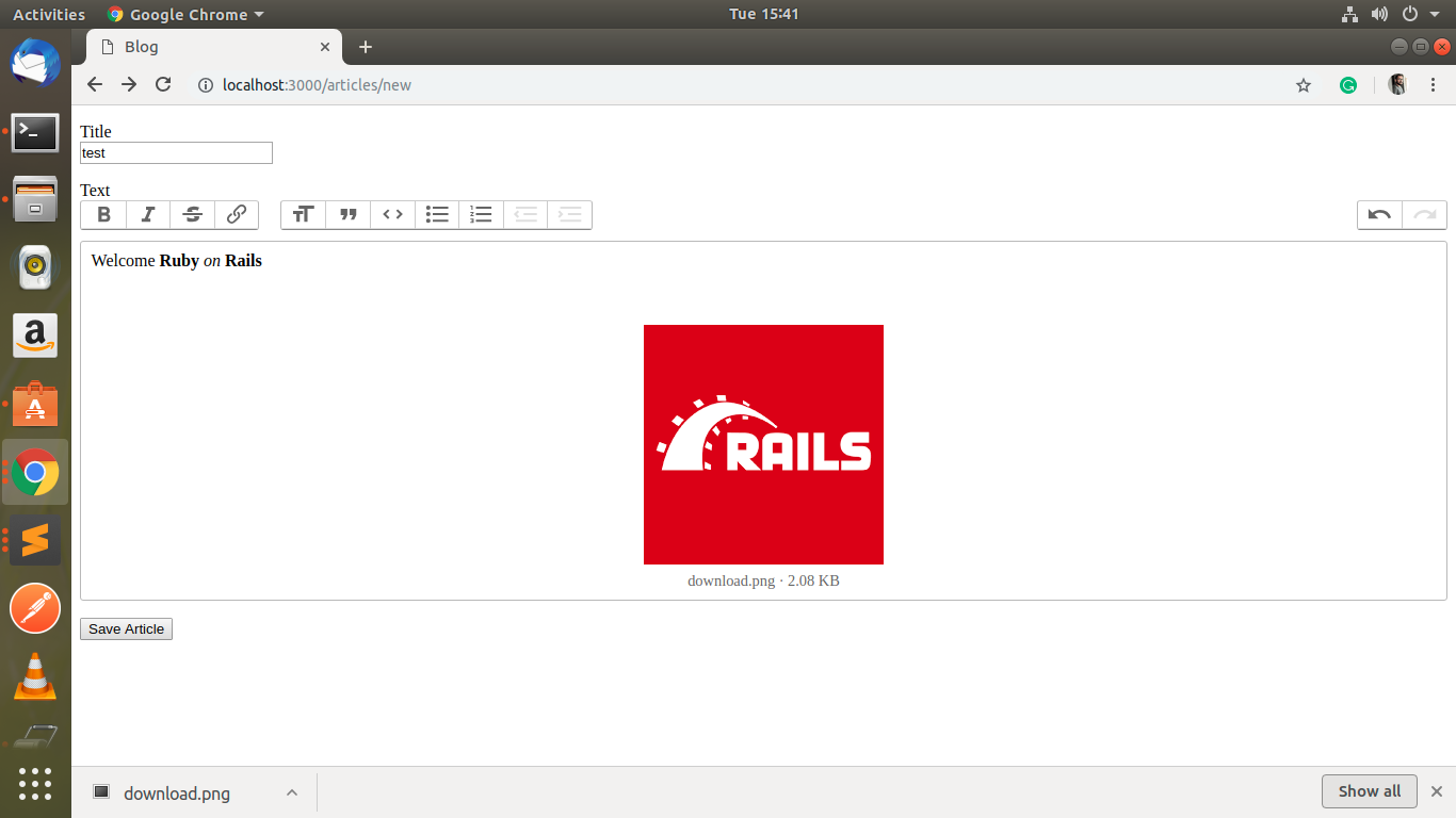 <p>Article Title:<strong><%= @article.title %></strong></p><p>Article Text:<strong><%= @article.text %></strong></p><%= link_to ‘Create new’,new_article_path %>That's it. Our app is done. Now let's check the various features available in the text editor provided by ActionText.