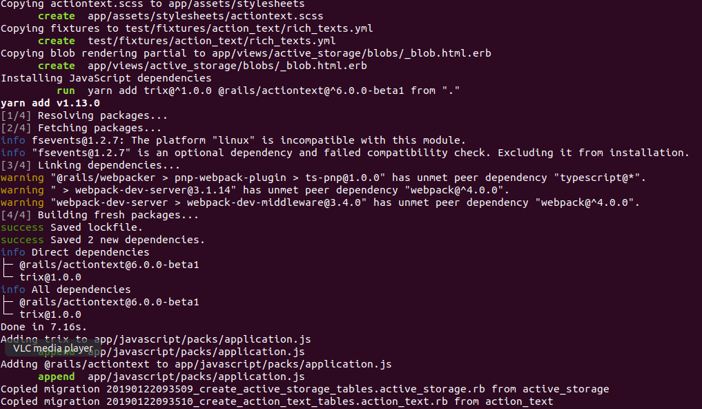 rails action_text:installThis will add all the dependencies required by Action Text. Most notably, this will add a new file javascript/packs/application.js and two action-storage migrations.