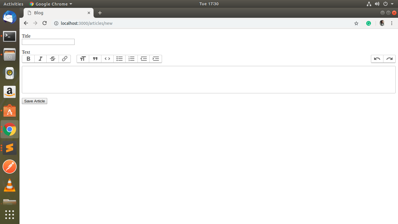 <%= form_with scope: :article, url: articles_path, local: true do |form| %><p> <%= form.label :title %><br> <%= form.text_field :title %> </p> <p> <%= form.label :text %><br> <%= form.rich_text_area :text %> </p> <p> <%= form.submit %> </p><% end %>Notice that for text field we are using form.rich_text_area which is provided by Action Text.