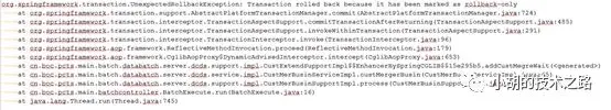 在addCustMegreWaitA方法准备提交的时候,transaction已经被addCustMegreWaitB方法设置为rollback-only了,但是addCustMegreWaitA方法中将addCustMegreWaitB的报错将给抓住消化了,没有继续向外抛出,所以addCustMegreWaitA结束的时候,transaction会执commit操作,所以就报错了。看看处理回滚的源码: