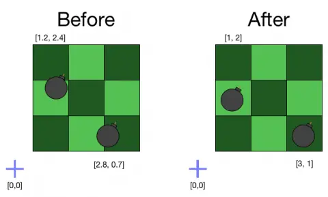 接下来的任务是确保炸弹在掉落到位,这样它们就能很好地与地板上的栅格对齐。 此网格(tile)上的每个图块都是1×1,因此进行此更改非常容易。