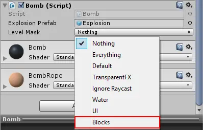 最后,在项目视图的Prefabs文件夹中选择Bomb预制件,并将Level Mask更改为Blocks。