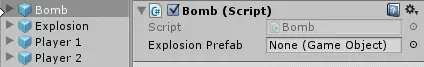 保存文件并返回编辑器。 在Prefabs文件夹中选择Bomb预制件,然后将Explosion预制件拖到Explosion Prefab插槽中: