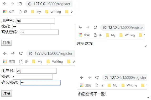 输入一波一样的密码和不一样的密码,浏览器的输出结果如下所示: