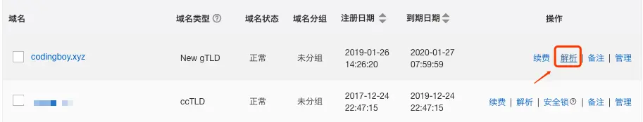 每次访问项目都用ip,显得有些繁琐,我们可以买个域名做下映射耍耍。 域名直接买就好,需要备案,搞定后打开域名管理页,找到刚买的域名 点击解析