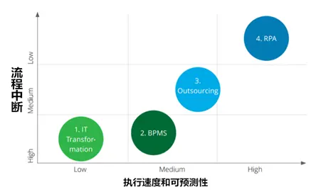 RPA的出现,一定程度上解放了被困在各个系统孤岛上的人类。 当然,RPA 绝对不是跨越众多系统实现流程自动化的唯一方法。在前RPA时代,公司可以依赖IT转型(IT Transformation)、业务流程管理软件(BPMS)以及外包(Outsourcing)等3种方法来实现流程自动化。