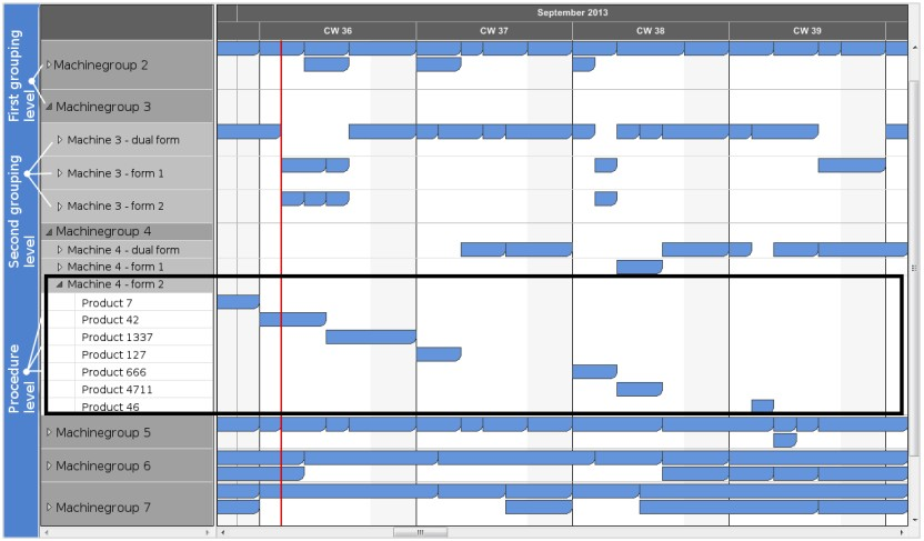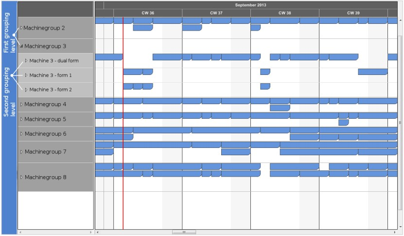在甘特图中活动通常以组的形式展现,比如machine Gantt代表机器负载可视化,它区分机器组和各自的机器,这被称为双阶段分组。甘特图的分组可以用来表示扩张或者收缩,这取决于你想从哪个角度查看详细数据。